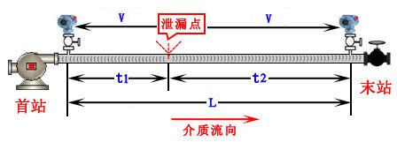 注:管道長度L、聲波傳波速度V、t1-t2為首末、站次生波接收時(shí)間差。