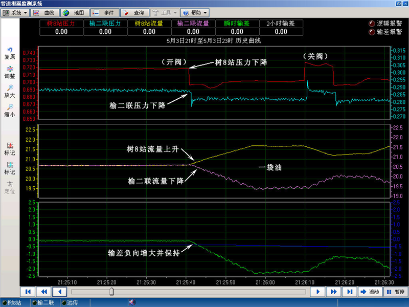 樹八站-榆二聯(lián)管線08年5月3日泄漏報警曲線圖