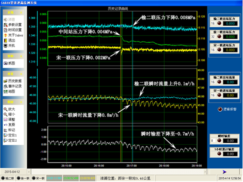 2015年5月30日榆二聯(lián)-宋一聯(lián)輸油管線發(fā)生泄漏,20時16分40秒泄漏開始,系統(tǒng)20時18分39秒發(fā)出報警,該次泄漏歷時2小時44分10秒,泄漏總量約為2.5m3,系統(tǒng)定位泄漏點在距中間站(徐一聯(lián))9.46公里處。有關(guān)部門根據(jù)系統(tǒng)給定信息緊急出動,盜油分子棄油倉皇逃逸。截獲盜失原油約2.5噸。