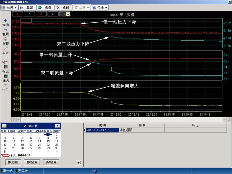 2010年1月1日肇一站-宋二聯(lián)管線泄漏報警曲線圖