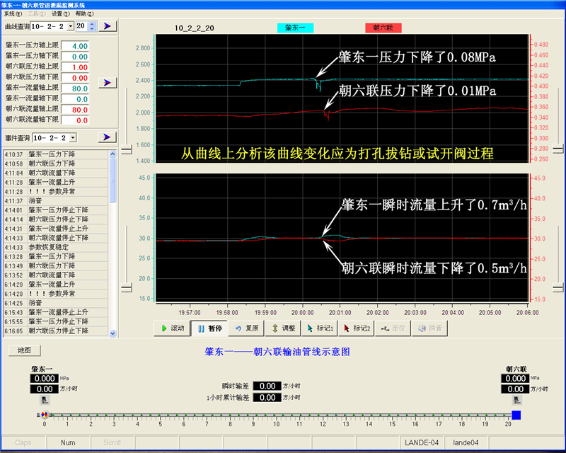 2010年2月2日肇東一聯(lián)-朝六聯(lián)輸油管線發(fā)生泄漏:20時0分28秒泄漏開始,18秒后系統(tǒng)報(bào)警,20時1分05秒結(jié)束,歷時37秒,泄漏排量約為1.2m3/h,泄漏總量約0.013 m3,系統(tǒng)定位泄漏點(diǎn)在距肇東一6.24公里處。該過程應(yīng)為打孔拔鉆瞬間報(bào)警圖(鉆透到拔鉆僅37秒鐘)。