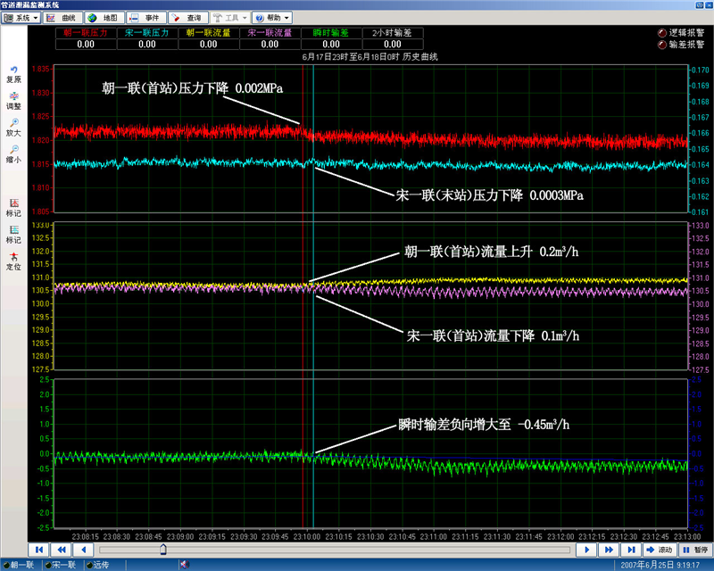 朝一聯(lián)-宋一聯(lián)輸油管線長54㎞,管徑ф273㎜,日輸原油3200m3。 2006年12月安裝LD-SAKER管道泄漏監(jiān)測系統(tǒng)。2007年6月17日23時09分58秒管線發(fā)生泄漏:朝一聯(lián)壓力從1.822MPa下降到1.820MPa下降幅度0.002MPa;宋一聯(lián)壓力從0.1643MPa下降到0.164MPa下降幅度0.0003MPa;朝一聯(lián)流量從130.7m3/h上升到130.9m3/h上升幅度0.2m3/h;宋一聯(lián)流量從130.65m3/h下降到130.55m3/h下降幅度0.1m3/h;輸差約為 -0.45 m3/h(因流量計量設(shè)備精度原有輸差 -0.1 m3/h左右,實際兩站輸差較先前變化應(yīng)為-0.3 m3/h),系統(tǒng)定位泄漏點在距朝一聯(lián)21.67公里處。該次為管線腐蝕穿孔。
